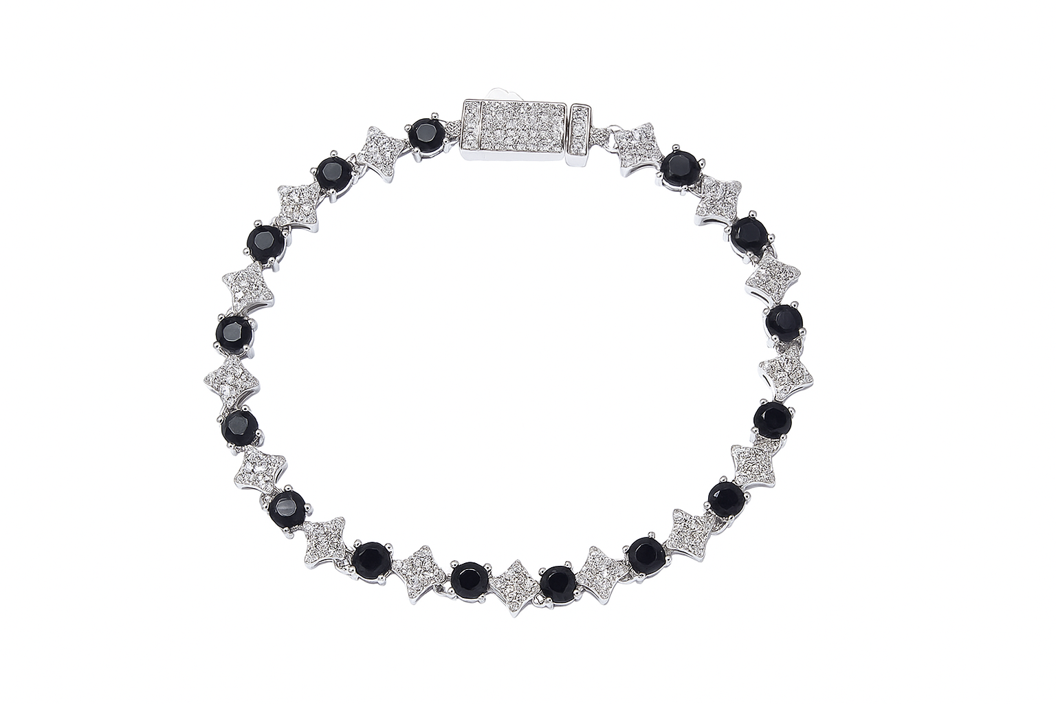 Elevate your accessory collection with this exquisite tennis bracelet, designed to bring timeless elegance and refined sparkle to any ensemble. Meticulously crafted with alternating round-cut brilliant white stones and intricately pavé-set star-shaped links, this piece embodies sophistication and charm.